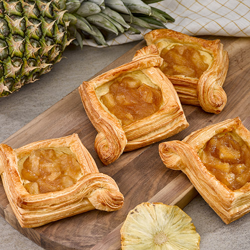 Etaler la pâte sur 3 mm d’épaisseur. Couper des carrés de 11 cm de côté puis les dorer. Couper une bande de 5 mm sur deux côtés opposés puis replier la pâte de chaque côté. Dresser de la crème pâtissière au centre de chaque carré puis déposer dessus du fourrage ananas. Mettre en pousse environ 2 heures à 25°C. Cuire à 170°C environ 20 min en four ventilé.